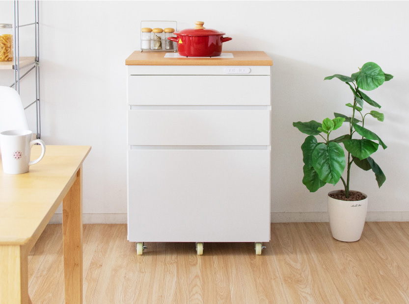 天板上にはタイルが敷かれており、熱いお鍋やトースターを置くことができとても便利。2段の整理しやすい浅型引き出しと、2Lペットボトルも入る深型引き出しにたっぷり収納できます。 キャスター付きでお掃除の時の移動も楽々。